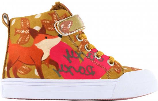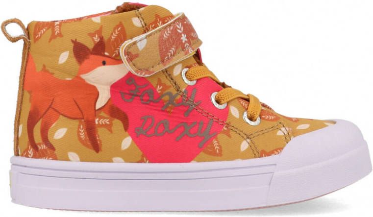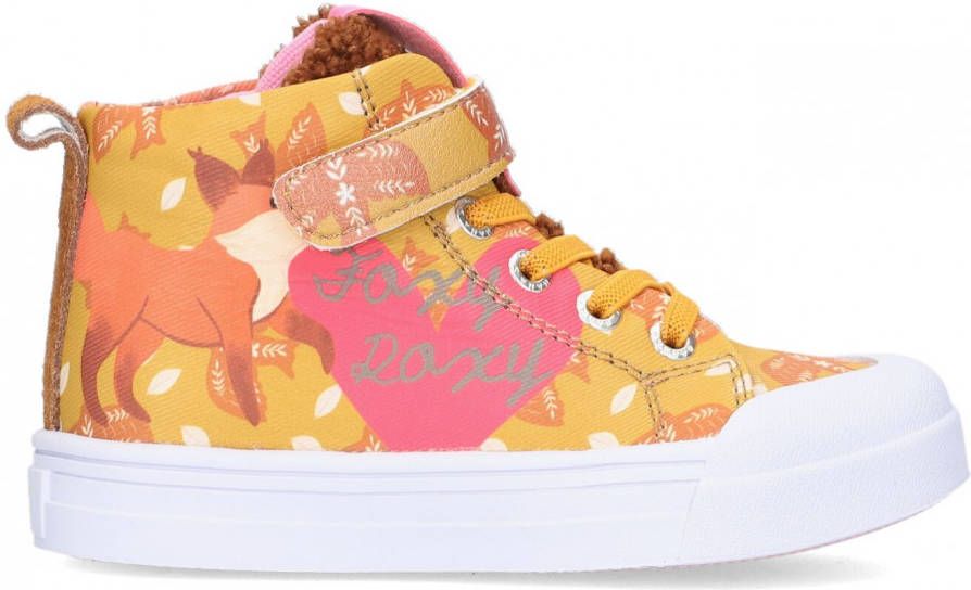 GO Bananas! Dat gaat zeker lukken met deze leuke hoge sneakers Foxyroxy uit de collectie van het gelijknamige merk. Dit vrolijke merk zorgt voor een lach op een ieders gezicht! De buitenkant is gemaakt van strak geweven canvas in een oranje kleur met roze accenten en is voorzien van diverse prints. Zo vind je aan de ene kant een roze Yeah logo met all over bloementje en aan de andere kant staat een lieve vos met een groot roze hart en rond vliegende vogels. Leuk detail is het banaantje achterop de hiel en de tong van zacht teddy stof met een fel roze label met goudkleurig merkopdruk. Met de klittenbandsluiting in combinatie met de elastische veters en de aantreklus op de hiel kan je kindje de sneakers gemakkelijk zelf aan en uit trekken. Extra handig is de witte rubberen stootneus, hierdoor kan de schoen tegen een stootje en blijft de schoen langer mooi. Want bij het klim en klauteren, buitenspelen of een potje voetballen mag niets in de weg staan! Het binnenwerk heeft een canvas voering met een antibacteriële en uitneembare binnenzool. De roze loopzool is voorzien van een gripvast profiel.
