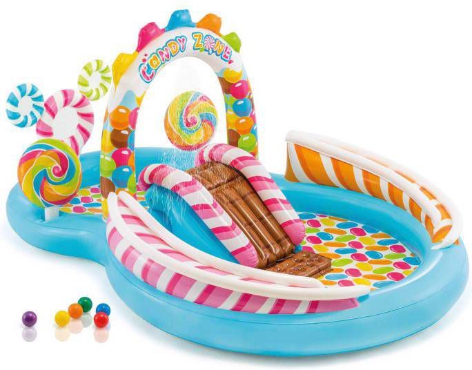 Het Candy Zone opblaasbare zwembadje van Intex ziet er enorm vrolijk uit door de felle kleuren en de opdruk van het snoepgoed. De losse speelballen en de losse lolly's verzekeren je extra veel plezier en maakt het zwembadje geschikt voor kinderen tussen de 3 en 7 jaar oud. Glijd van de glijbaan af en wordt verrast door het water uit de sproeier!.
