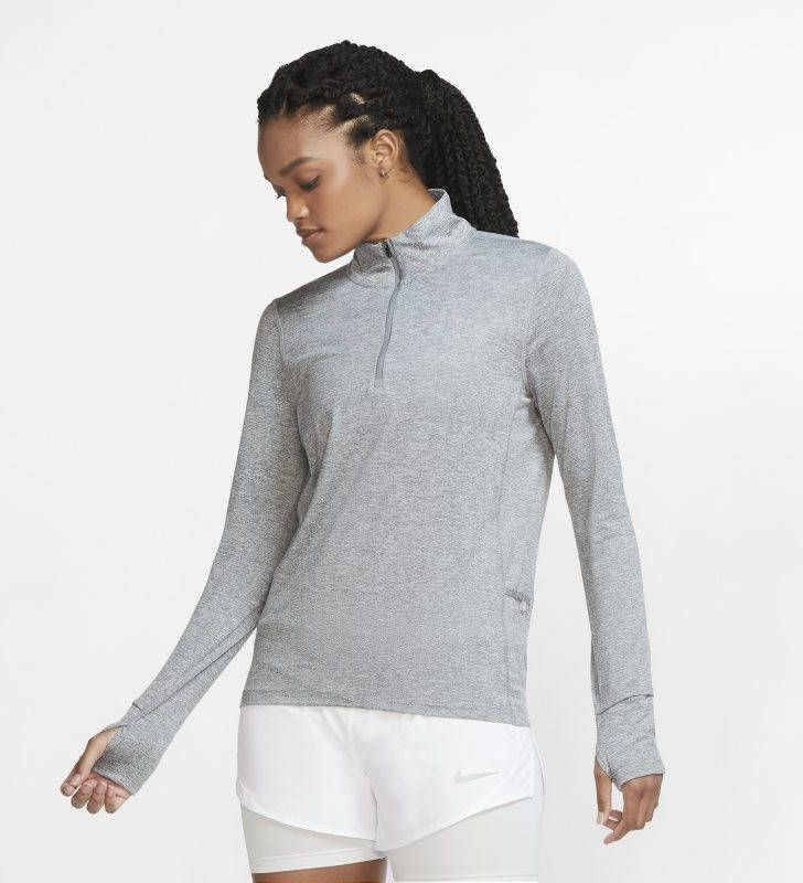 Eindig als eerste met deze Running Element 1/4 Zip Top voor dames van Nike. Deze standaard-fit top komt in een grijze kleurstelling en is gemaakt van lichtgewicht stretchy poly stof dat duurzaam en comfortabel is. Het heeft een 1/4 ritssluiting met lange mouwen met een kijkvenster zodat je je tijden en duimgaten kunt bijhouden voor extra bedekking. Het is gemaakt met Dri-FIT-technologie die zweet afvoert om je koel te houden als je in het zweet werkt, terwijl je in een linker opbergvak je benodigdheden kunt opbergen. Met reflecterende elementen voor nachtelijke runs, is het afgewerkt met een beroemd Swoosh-logo op de borst. Mag in de wasmachine. Ons model is 5'4.5" en draagt een maat small.. Material: 88% polyester/12% elastaan.