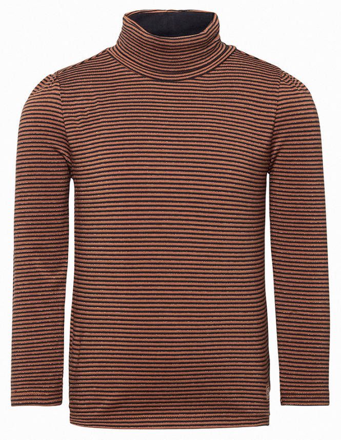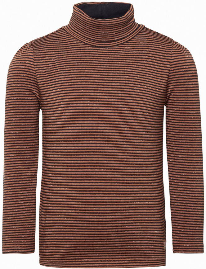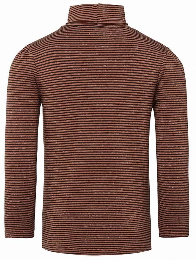 Noppies Bayamo T shirt met lange mouwen voor meisjes in de kleur bruin. Dit tricot T shirt heeft een col met omslagboord en lange pofmouwen. Het model heeft een all-over strepen dessin met glitters. Maak je look compleet met een Noppies rokje.